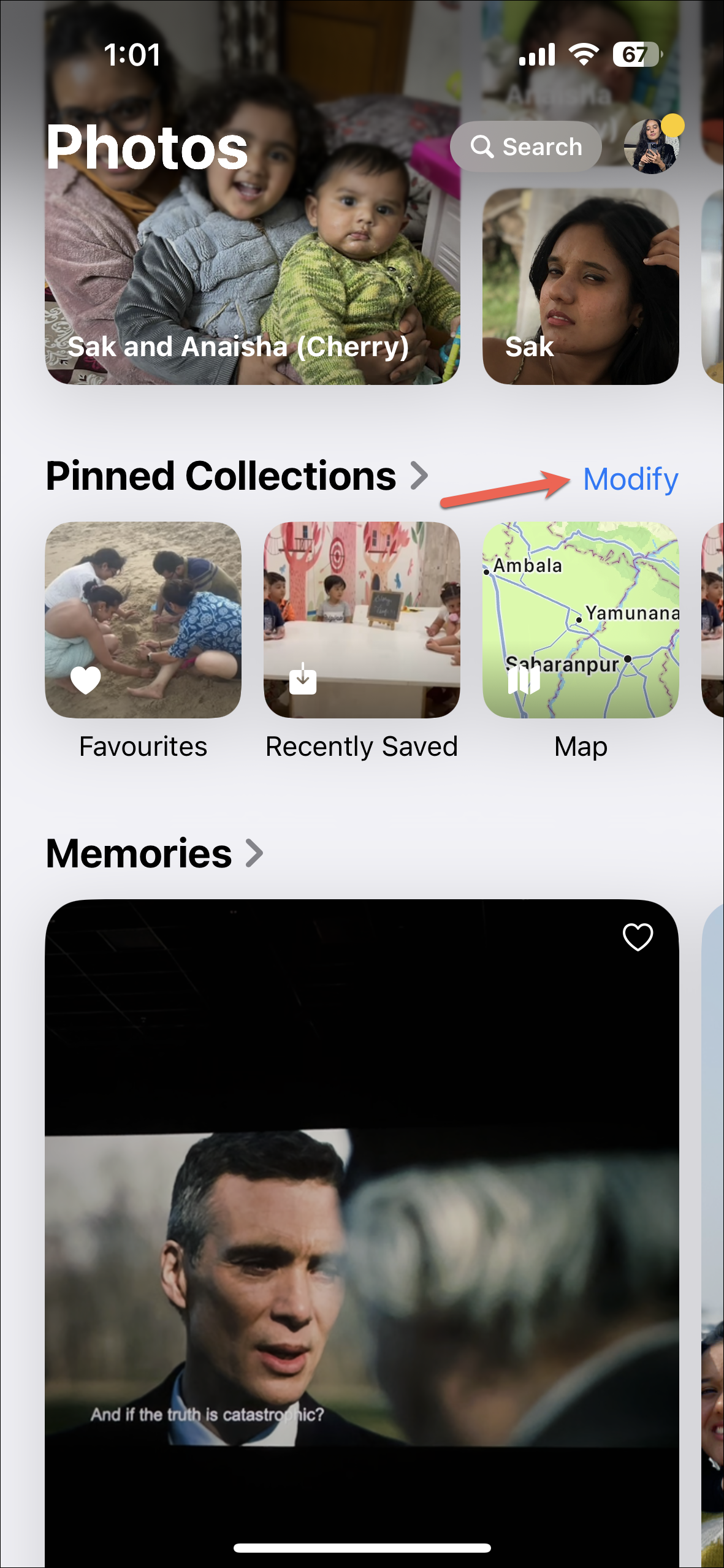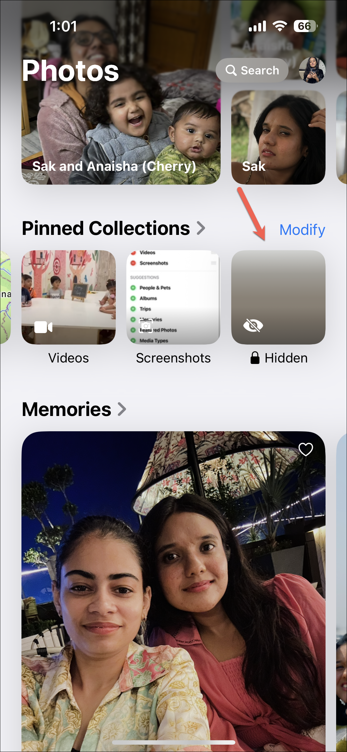- You can also customize the 'Pinned Collections' category in the new Photos app. Tap on 'Modify' next to it.