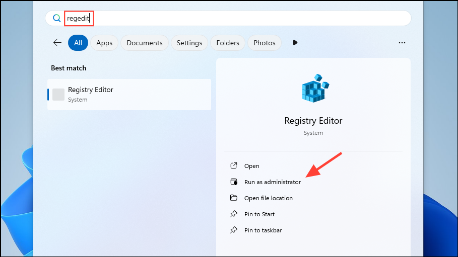 regeditand click on 'Run as administrator' on the right to launch the Registry Editor.