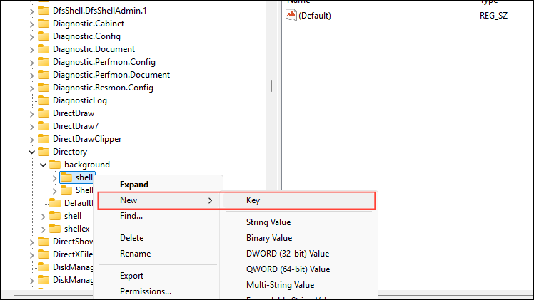 - Right-click on the 'Shell' folder and go to 'New' before selecting 'Key'.