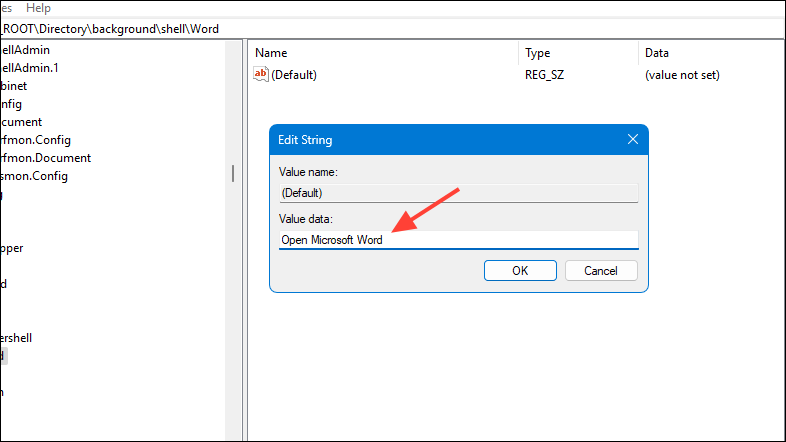 - Enter the path to the application launcher in the Value Data field and click on OK. For Microsoft Word, it is usually