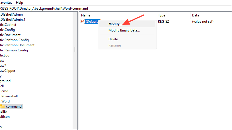 - Now, with the 'command' key selected, right-click on the 'Default' String on the right side and click on 'Modify'.