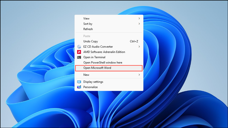- Now, when you right-click on the desktop or inside the File Explorer, you should see the new shortcut to Microsoft Word in the context menu.