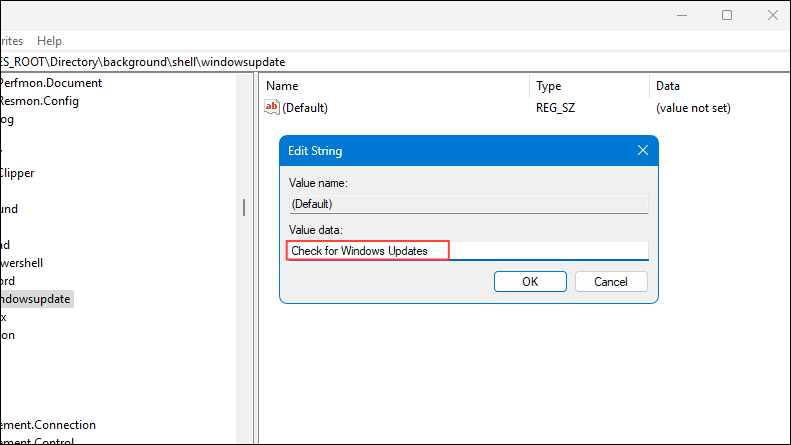 - In the Value Data field, type in the name you want for the shortcut, such as 'Check for Windows Updates' and click on OK.