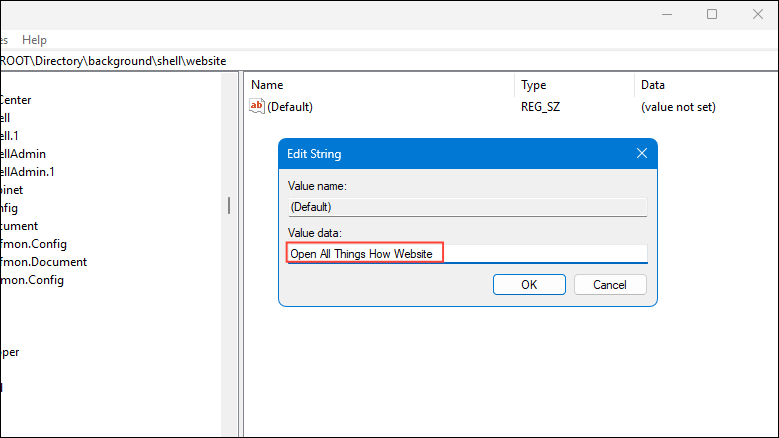 - Then, in the Value Data field, type in the text you want to appear as the menu item, such as
