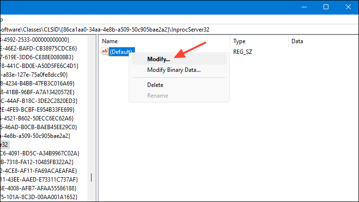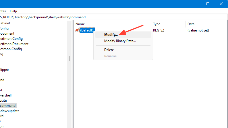 - Select the newly created key, right-click on the 'Default' string on the right and click on 'Modify'.