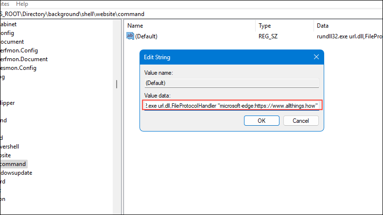 - In the Value Data field, type in the website you want the shortcut to open, such as