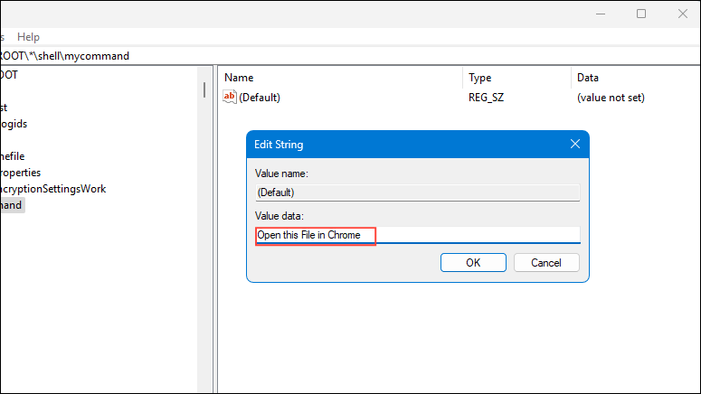 commandunder themycommandkey and right-click on the 'Default' string on the right. - Enter the path to the executable in the Value Data field followed by