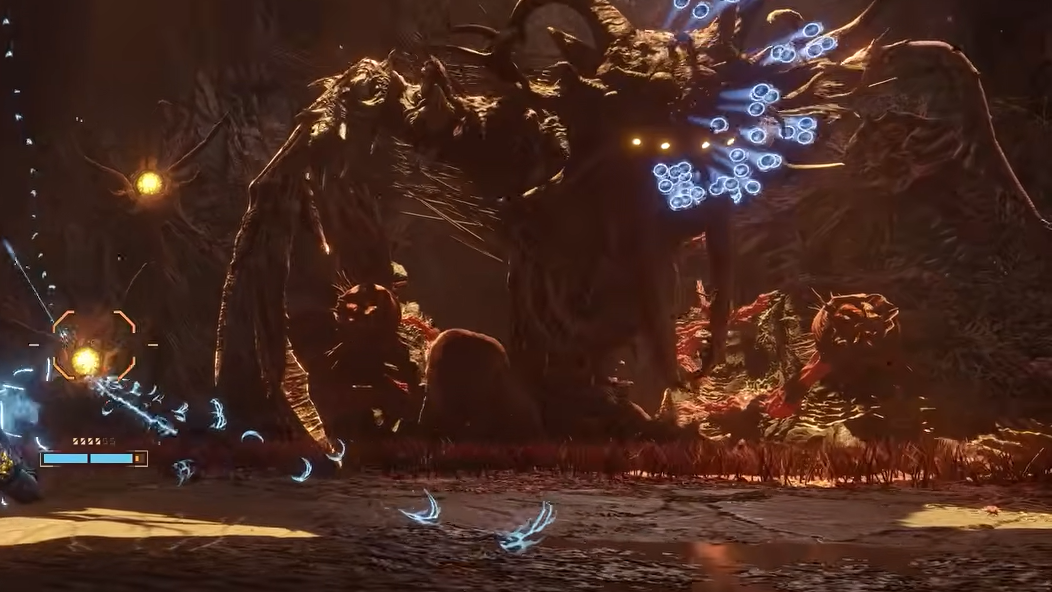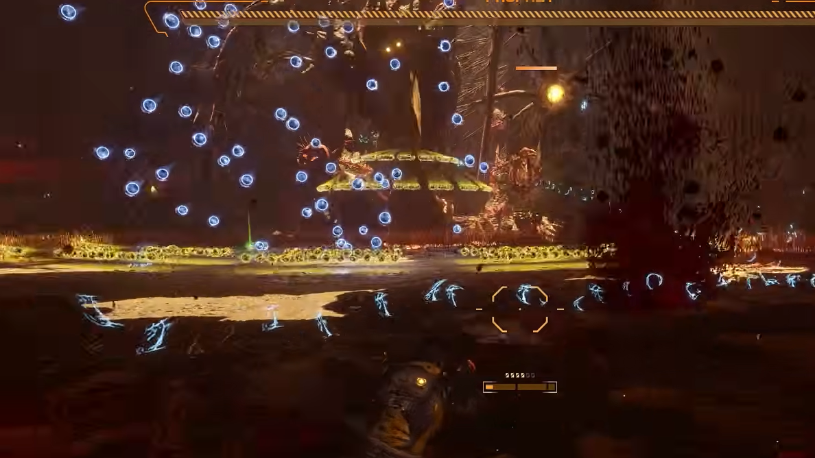Prophet's health bar shows dashes across it whenever the boss is sealed, signaling damage immunity. To break that state, destroy the glowing tentacled creatures clinging to the walls on either side of the boss. Once they are all cleared, Prophet splits open down the middle and exposes its core.
