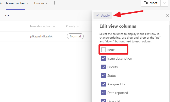 The Edit view columns pane will appear on the right. The columns that are selected are the ones that appear on the list. Deselect the column you want to hide and click ‘Apply’ to save the changes.