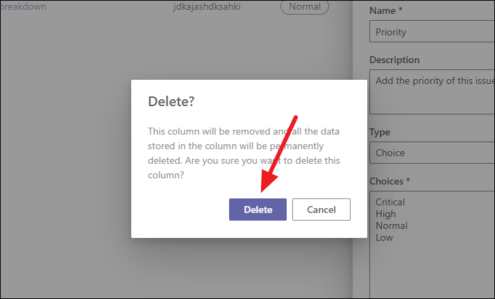 A confirmation prompt will appear on the screen. Click ‘Delete’ to permanently delete the column and the data in it.