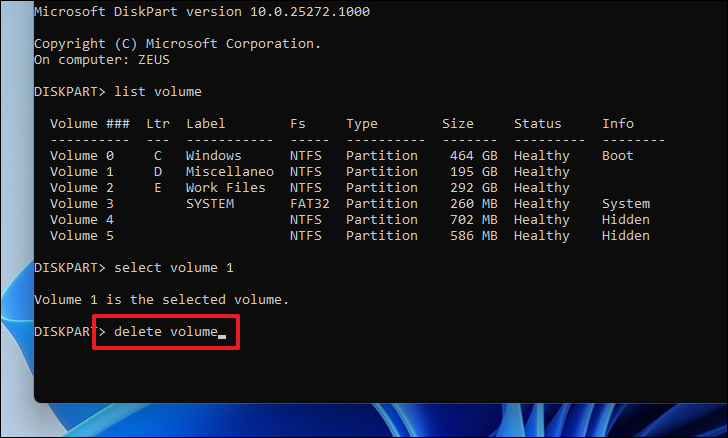 Step 6: Once the volume is selected, type delete volume and press Enter to delete it.