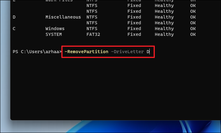 Step 4: Identify the drive letter of the partition you want to delete. Then, type Remove-Partition -DriveLetter <drive letter> (replace <drive letter> with the actual letter) and press Enter.