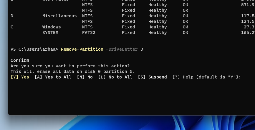 Remove-Partition -DriveLetter FNote: Replace F with the correct drive letter of the partition you intend to delete.