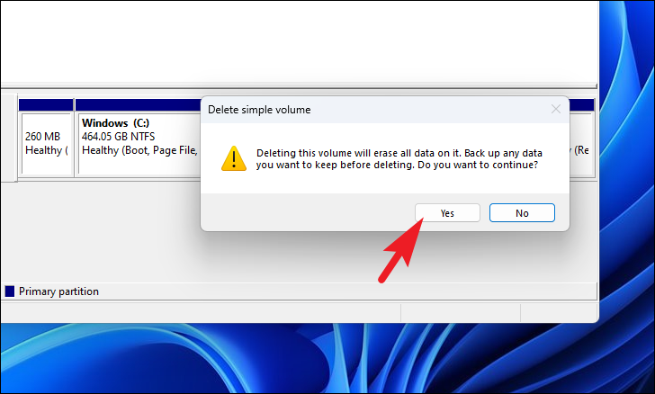 Step 3: A warning message will appear, confirming that you want to delete the volume and that all data will be lost. Click 'Yes' to confirm the deletion.