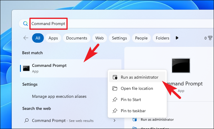 Step 1: Open Command Prompt with administrative privileges. Click on the Start Menu, type Command Prompt, right-click on the 'Command Prompt' app, and select 'Run as administrator'.