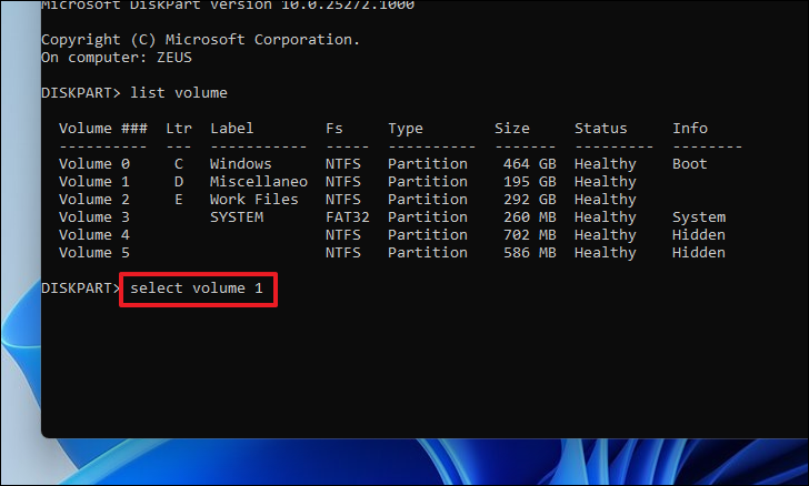 Step 5: Identify the volume number of the partition you wish to delete. Type select volume <volume number> (replace <volume number> with the actual number) and press Enter to select it.