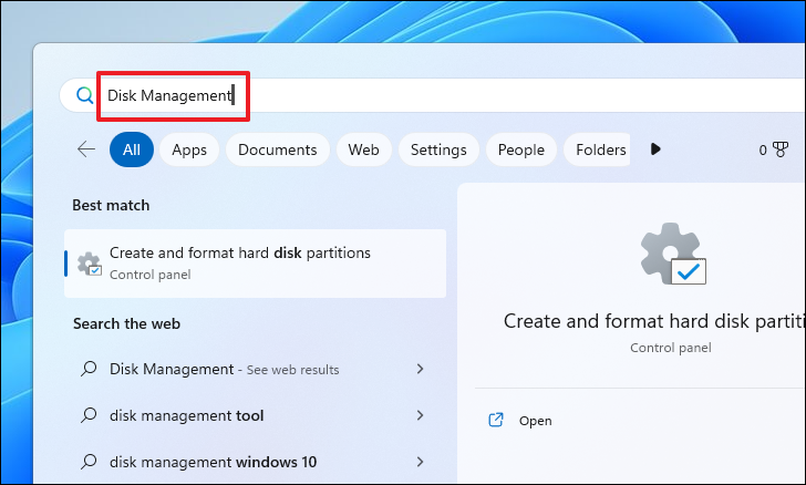 Step 1: Open the Disk Management utility by clicking on the Start Menu and typing Disk Management in the search bar. Select the 'Create and format hard disk partitions' option from the search results.