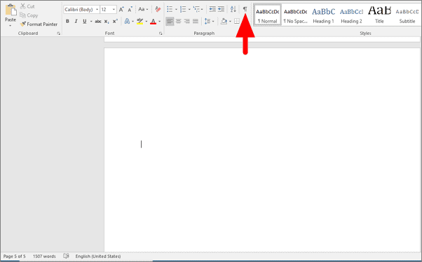 Step 1: Enable the display of paragraph marks to identify hidden formatting symbols causing the blank page. Click on the ΒΆ symbol in the 'Home' tab of the toolbar.