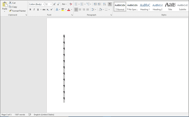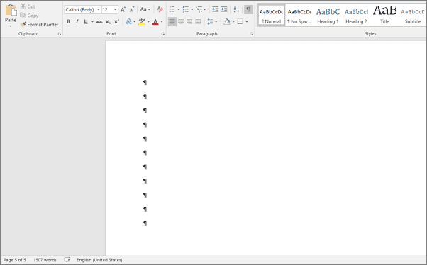 Step 3: Highlight all the paragraph marks on the blank page. You cannot select them by dragging from right to left; instead, drag from left to right or double-click on each paragraph mark to select it.