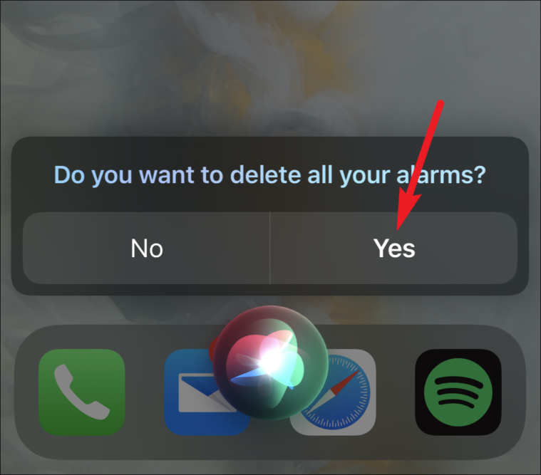 Then, say “Delete all my alarms”. Siri will ask you for confirmation before taking any action. Tap ‘Yes’ to provide her with permission.