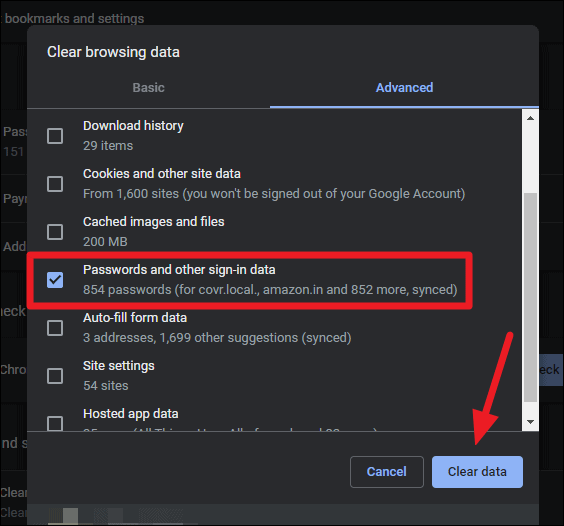 Step 4: Check the box next to Passwords and other sign-in data. Then, click on the Clear data button to remove all saved passwords from your Chrome browser.