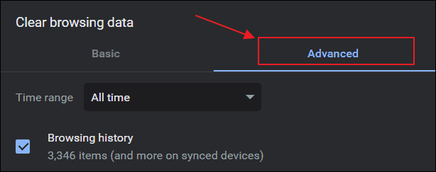 Step 2: In the Clear browsing data window that appears, switch to the Advanced tab to access more options.