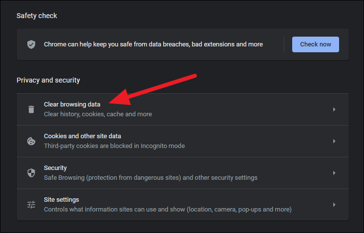 Step 1: Go back to the main Settings page in Chrome. Under the Privacy and security section, click on Clear browsing data.