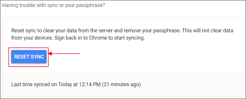 Step 5: Scroll to the bottom of the sync settings page and click the Reset Sync button. This action will pause syncing across your devices and delete all saved passwords from your Google Account.