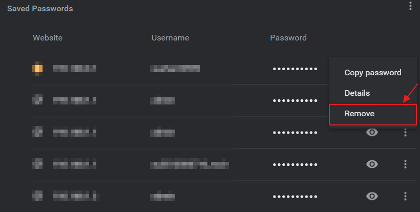 Step 3: From the dropdown menu, select Remove to delete the specific password from Chrome.