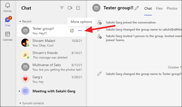 Hover on the chat thread for the conversation you want to delete in the chat list on the left half of the window. A couple of options will appear. Click the ‘More options’ icon (three-dot menu).