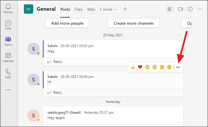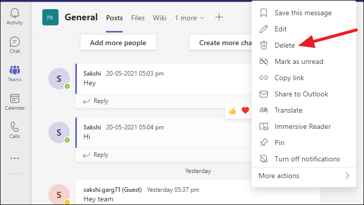 Then, go to the message and hover on it. Click the ‘More options’ icon and finally, click ‘Delete’ from the menu that opens.