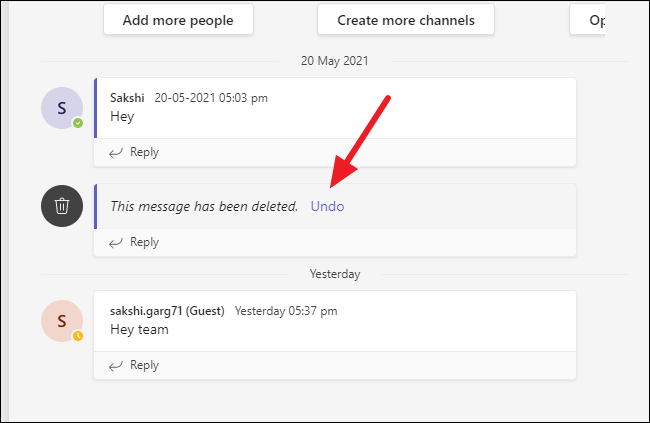 The message will be deleted. In its place, the message “This message has been deleted” would appear, which is what everyone else in the team would also see. There will also be an additional option for ‘Undo’ next to it. Click it if you wish to undo the delete action. The message would reappear for everyone.