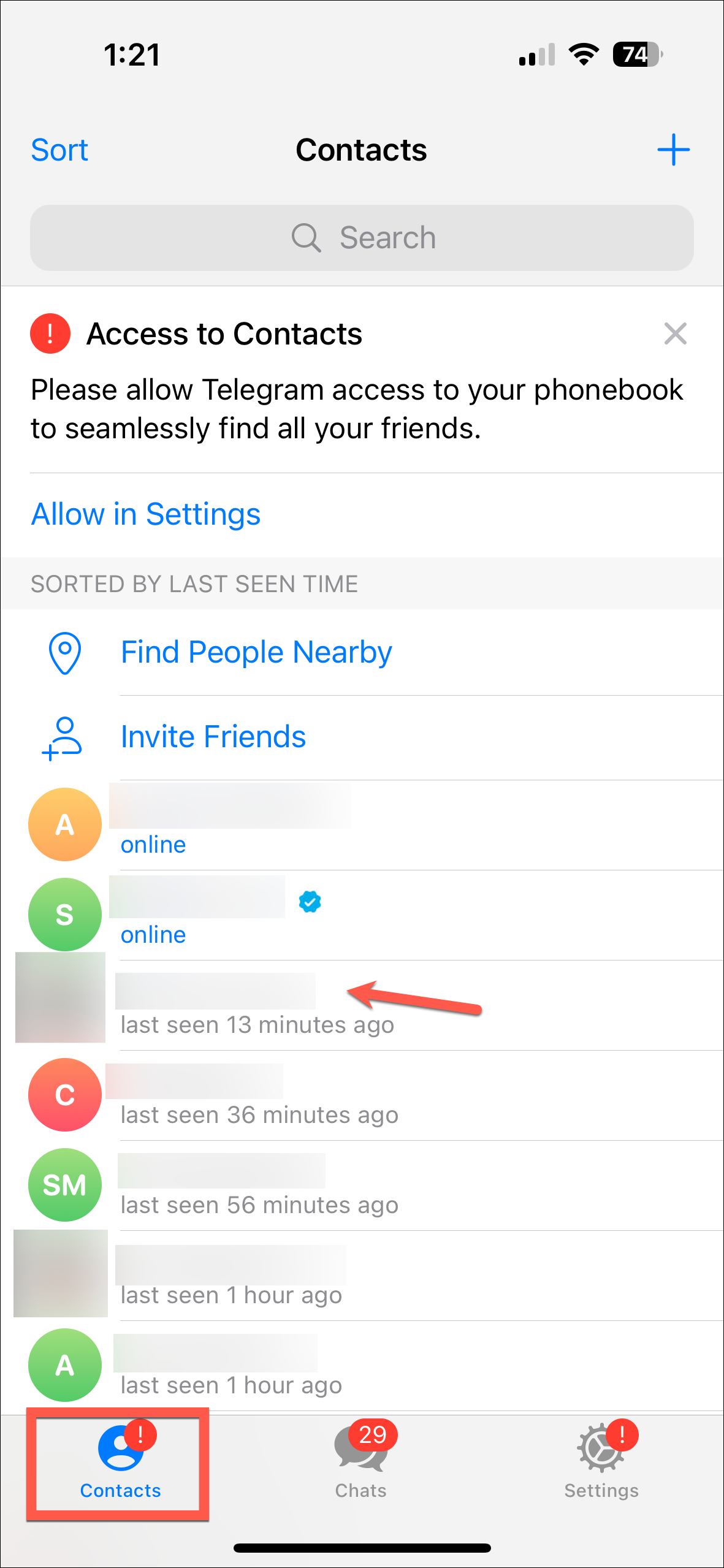 - Open Telegram on your iPhone and tap on 'Contacts' in the bottom-left corner.