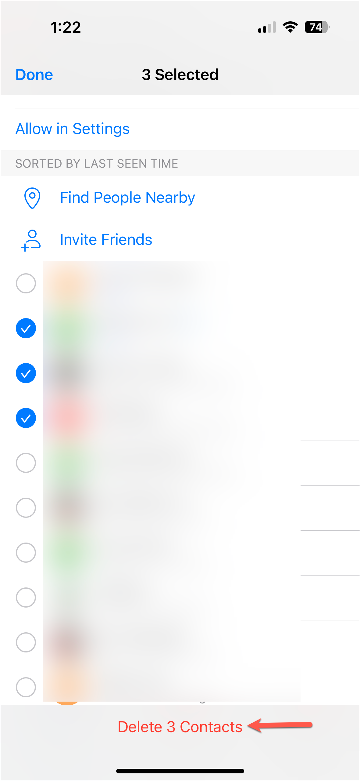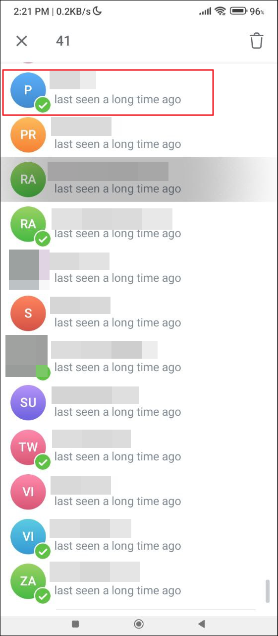- To delete multiple contacts, long press on the first contact and then tap on the others to select them. A small circle with a checkmark will appear next to the contacts you select.