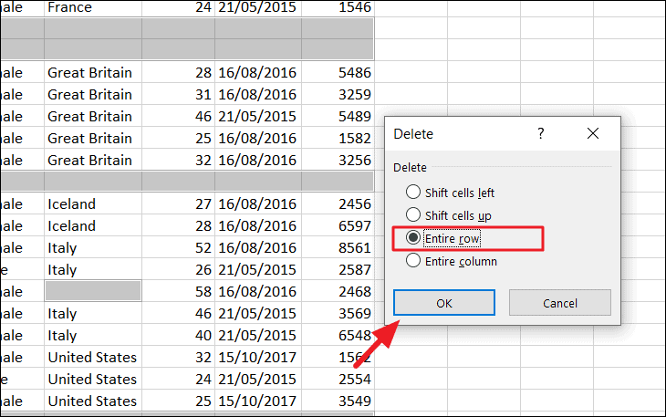 Step 5: In the Delete dialog box, select Entire Row and click OK.
