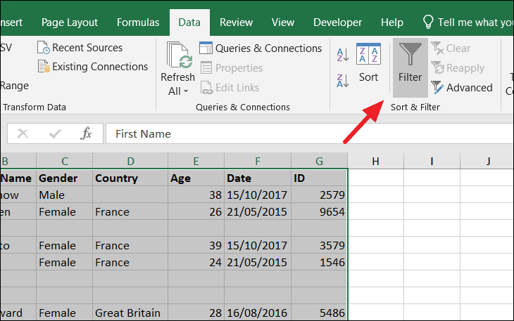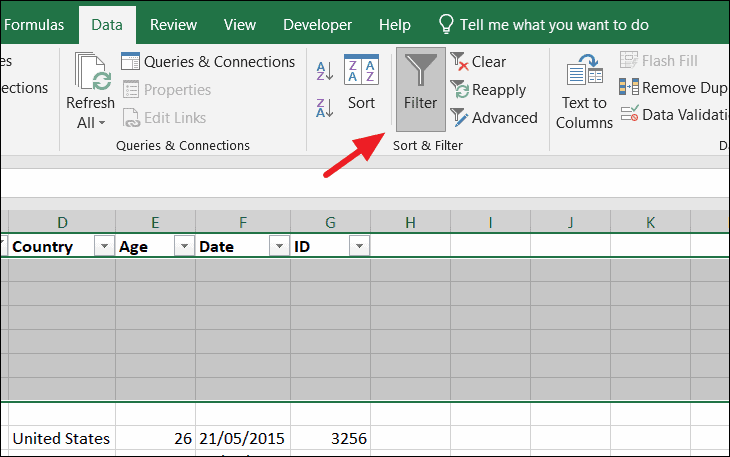 Step 2: Go to the Data tab and click on the Filter icon in the Sort & Filter group, or press Ctrl+Shift+L to apply filters.