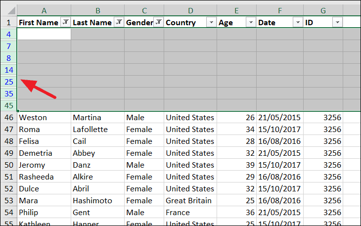 Step 4: The filtered rows will now show only the blank rows. Select these rows by clicking on their row numbers. The row numbers will appear in blue.