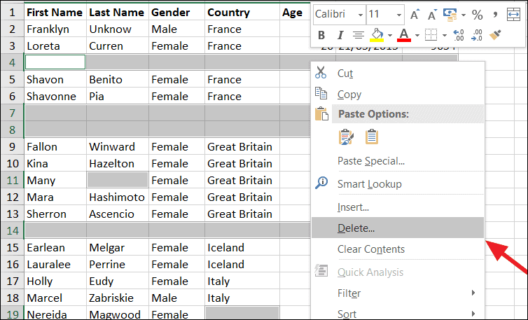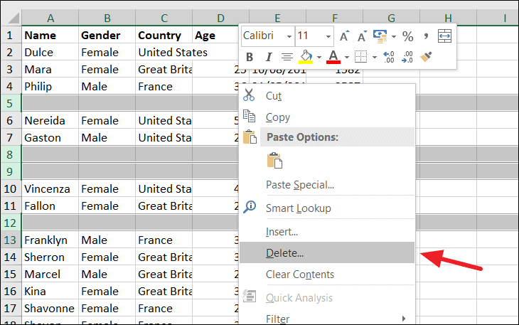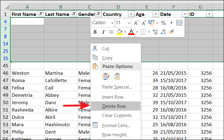 Step 6: Select the filtered rows, right-click, and choose Delete Row.