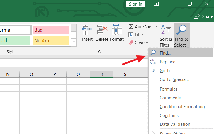 Step 2: Go to the Home tab, click on Find & Select, and choose Find. Alternatively, press Ctrl + F to open the Find and Replace dialog box.