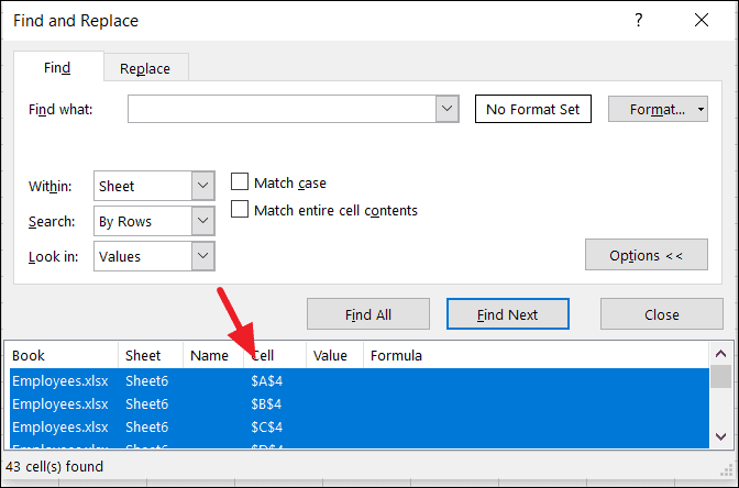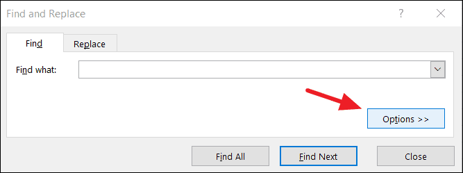 Step 3: Leave the Find what field blank. Click on the Options button to expand the dialog box.