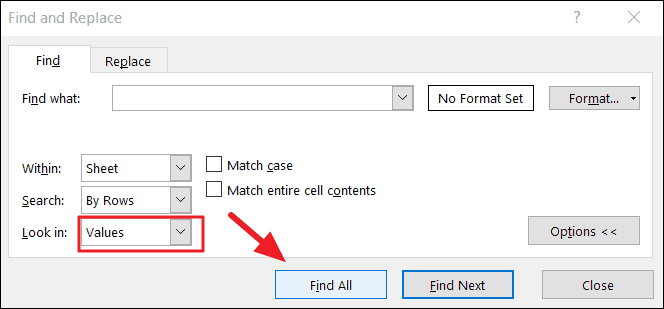 Step 4: Under Look in, select Values. Ensure that Within is set to Sheet and Search is set to By Rows. Click Find All.