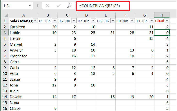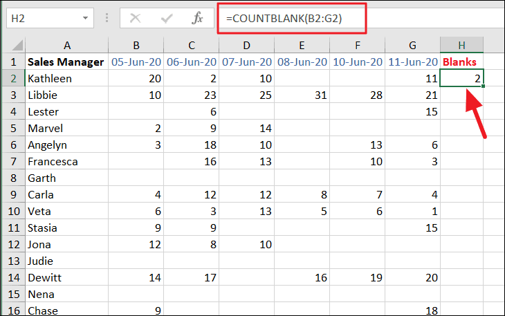 =COUNTBLANK(B2:G2)This formula counts the number of empty cells between columns B and G in the second row.