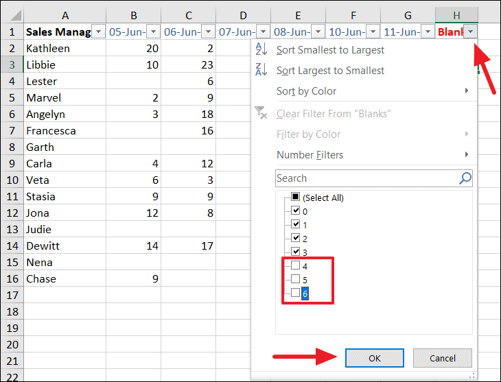 Step 5: Click the filter arrow on the Blanks column and select the criteria for deletion. For instance, to remove rows with four or more blank cells, uncheck numbers less than 4.