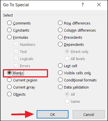 Step 3: In the Go To Special dialog box, select Blanks and click OK.