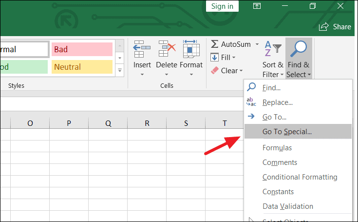 Step 2: Navigate to the Home tab, click on Find & Select, and choose Go To Special from the dropdown menu.