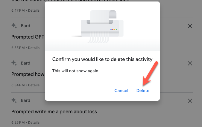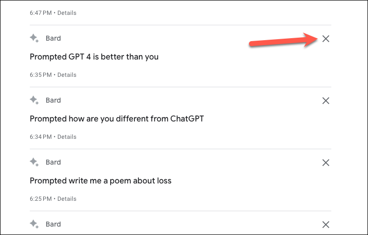 Your Bard Activity will open in a separate tab. Under the 'Your Activity' section, find the prompt you want to delete and click on the 'Delete (X)' button next to it.