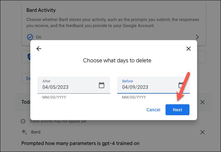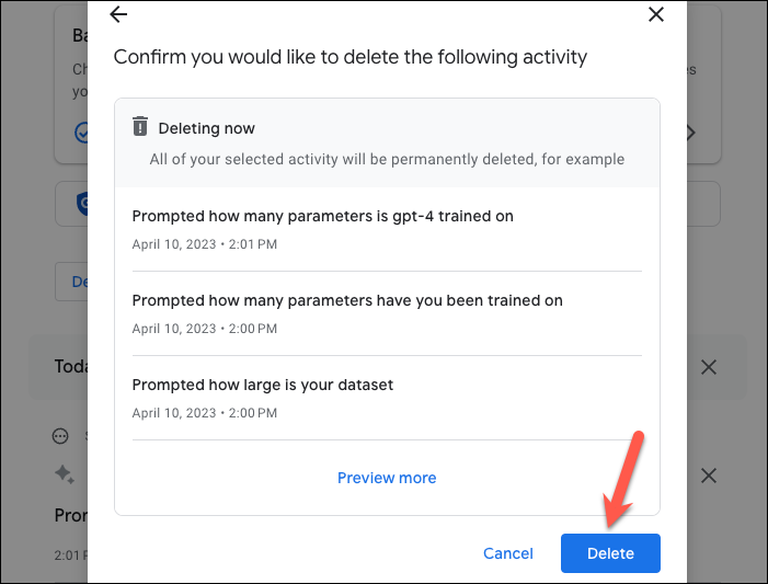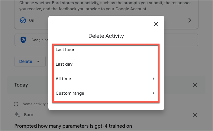Instead of deleting individual prompts, you can also delete your activity on the basis of time. For example, you can delete it based on the hour, day, or all time.