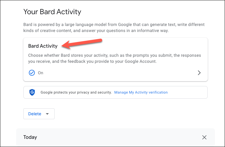 Go to Bard Activity from the Bard website. Then, click the 'Bard Activity' option.
