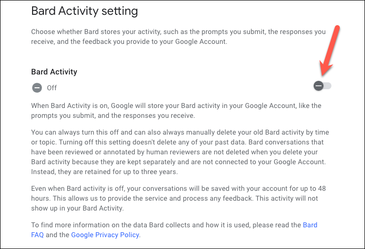 You can also turn off Bard activity for your account. When you turn off activity, none of your prompts will be saved to your Google account. But Google still saves your conversations for up to 48 hours in this case to process any feedback; it won't be visible in your account. Turning off activity does not affect the past data, and the timeline of 3 years retention period applies to it.