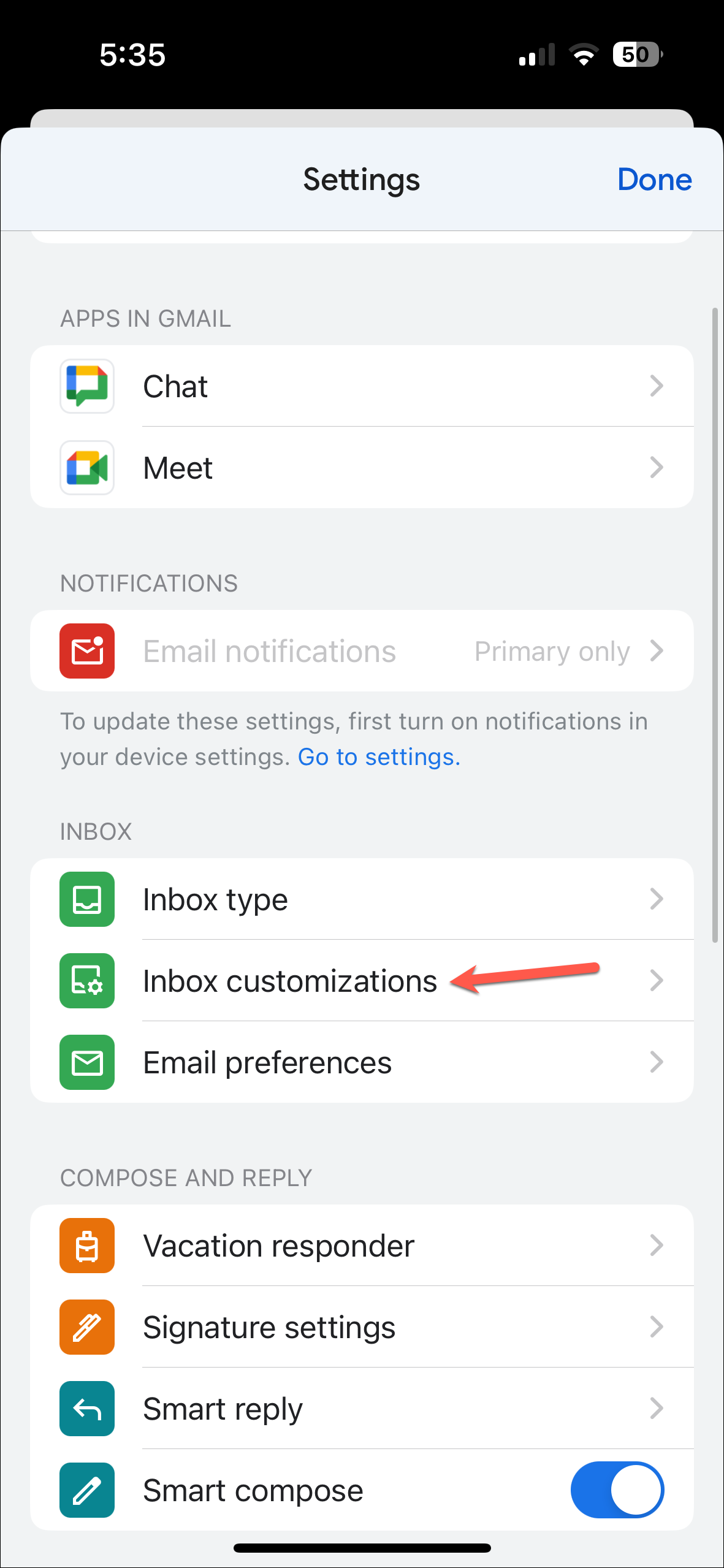 - When the Settings page opens, tap on 'Inbox customizations' under the 'Inbox' section.